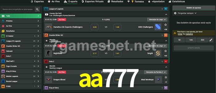 O aa777 oferece uma grande seleção de opções de apostas em e-sports com probabilidades competitivas
